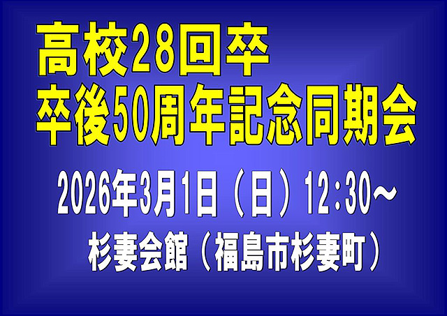 さて、我々福高28回生は明年3月1日をもって卒業から50年を迎えます。これを機に下記により同期会を開催する運びとなりました。是非参加くださいますようご案内申し上げます。
