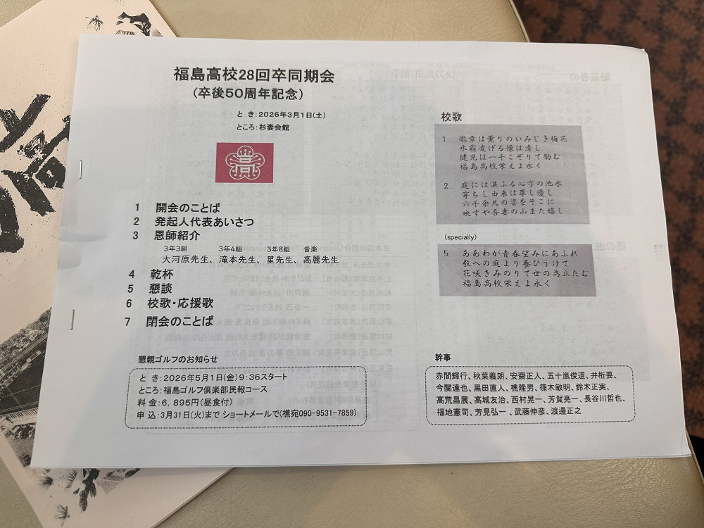 令和8年3月1日(日)12:30より、福島市の杉妻会館4階牡丹の間にて、28回卒同期会(卒後50周年記念)が開催されました。